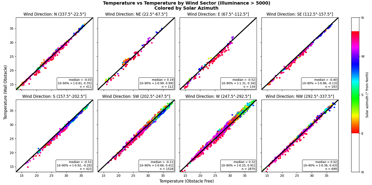 Figure 2. Relationship between temperature measured by station A (Obstacle Free) and station B (Wall Obstacle) for grouped wind directions. The markers are coloured by the solar azimuth. The median, 10th–90th percentile and the number of the considered sample is shown in the in-plot frames. For the analysis only data coinciding with Illuminance >5000Lux (40W/m2) were used to investigate the impact of solar radiation heating on measurements. The data were aggregated in 10-min intervals to securely identify the wind direction.