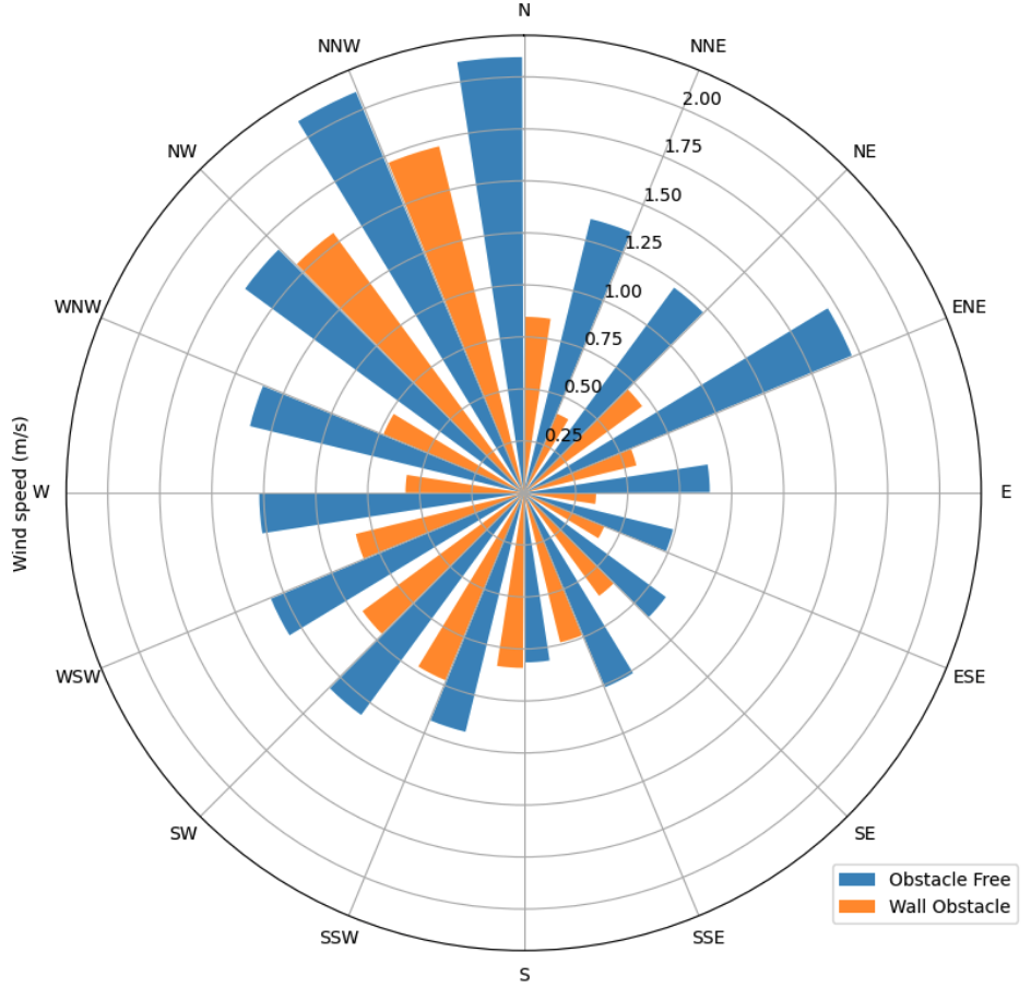 Figure 4. Wind rose showing the average wind speed per cardinal direction for Station A (Obstacle Free) and Station B (Wall Obstacle). 10-min wind averages were used for the plot.